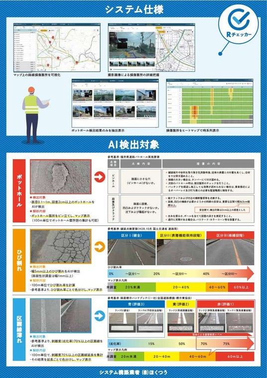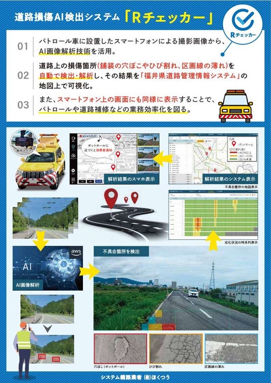 さらに、北電技術コンサルタント株式会社(北陸電力グループ)と連携し、スマートフォンを活用した道路損傷AI検出システム(Rチェッカー)の開発も推進しています。