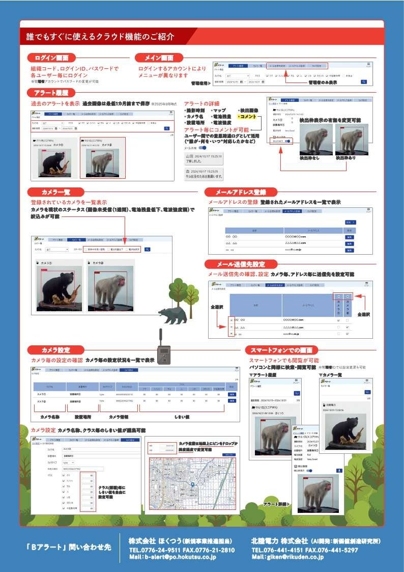 Bアラートは、トレイルカメラの画像からAIがツキノワグマを自動検出し、関係者へリアルタイム通報を行うシステムです。