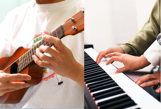 ピアノ・ウクレレ・アコースティックギター・バイオリンの楽器にふれて、音を出すだけでワクワクする体験を楽しみませんか。