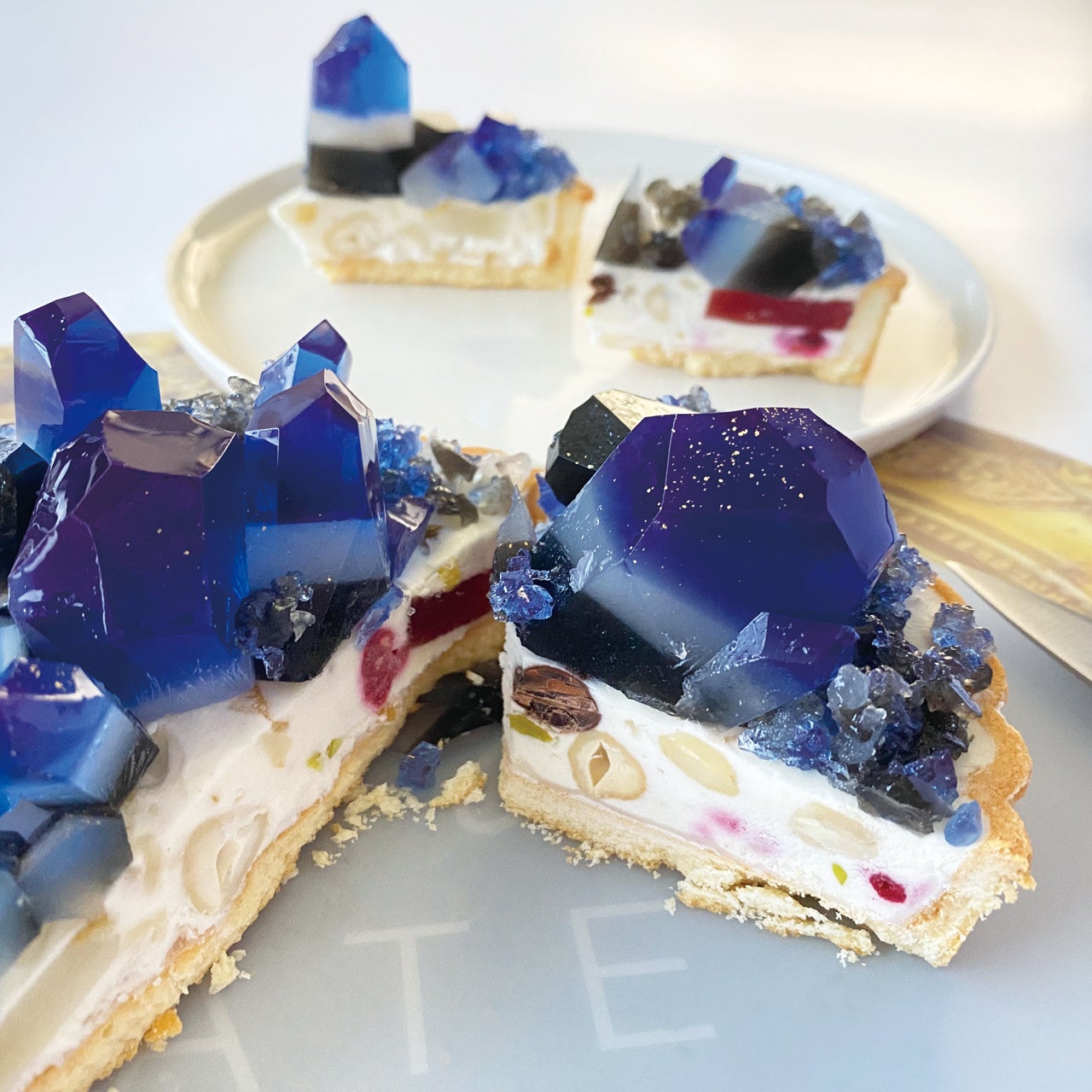冬の夜空に深く輝く、12月の誕生石“ラピスラズリ”をイメージしたアイスケーキタルトが登場。吸い込まれるような群青のこうぶつヲカシでラピスラズリの神秘的なきらめきを表現しました。ところどころに金箔の輝きを散りばめて、冬の星空を閉じ込めたような凛とした美しさをまとっています。ひとつひとつ、職人の手によって丁寧に切り出される琥珀糖の“切りたての輝き”は、このタルトならではの特別な魅力。大切な人への贈り物にはもちろん、1年を頑張った自分へのご褒美にもふさわしい、特別な一品に仕上がりました。