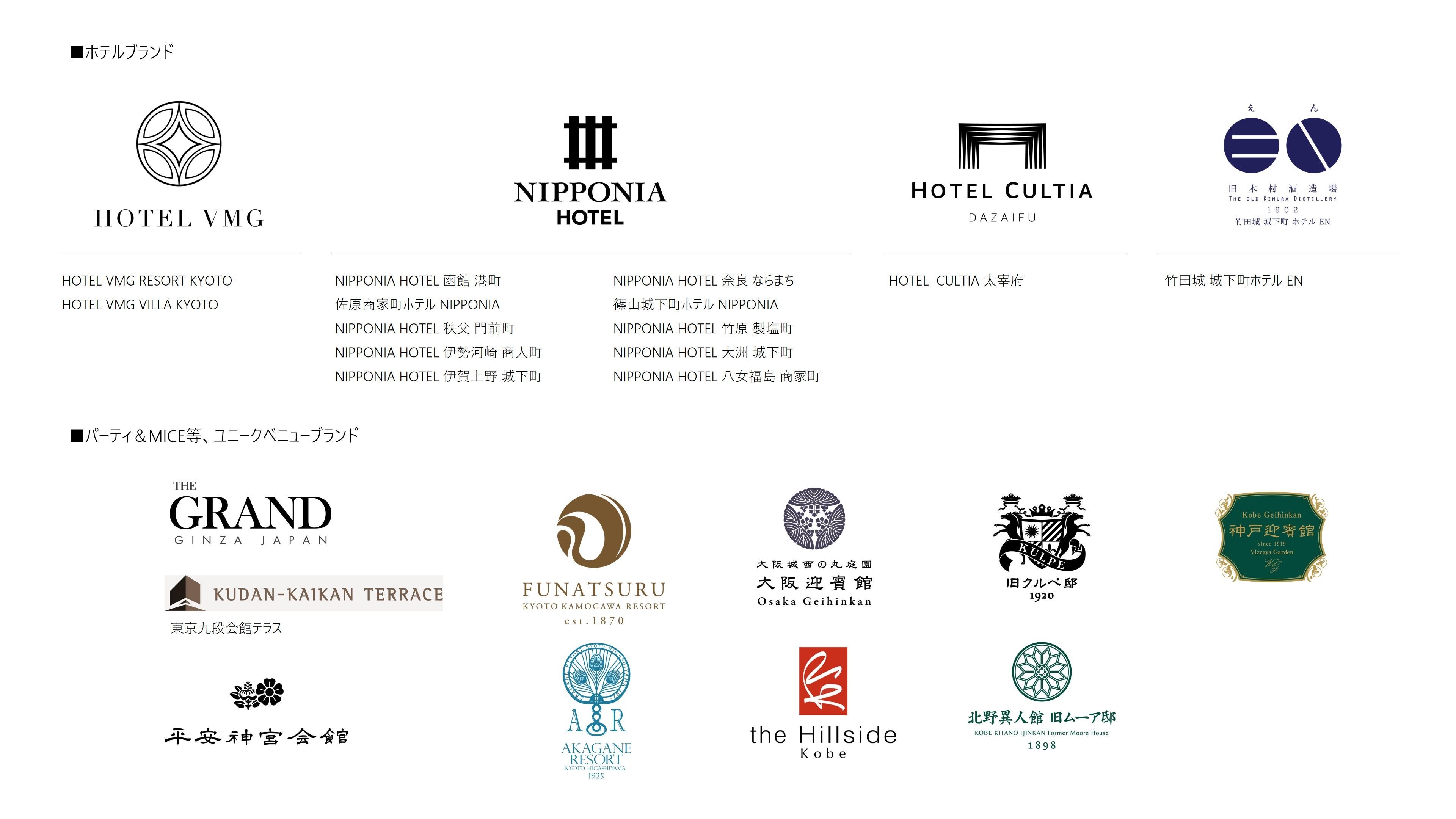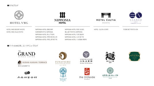 VMG HOTELS & UNIQUE VENUESは、日本全国に24施設展開するホテル・宿泊施設のブランドで、歴史的建造物や文化的に価値のある場所を活用した宿泊体験を提供することを特徴としています。VMGは、文化財級の建物や地域資源を再生・活用し、現代のニーズに合った宿泊施設として運営することで、顧客に特別な体験を提供しています。施設は、宿泊だけでなく、結婚式やイベント、MICEなどのユニークな場所としても利用されており、伝統的な日本文化やその地域の魅力を存分に感じられる環境が整えられています。VMGの施設は、施設ごとにその土地の歴史や文化を反映した体験をできることが魅力です。