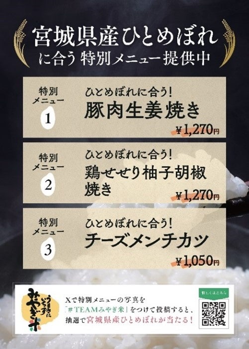 また11月13日(木)より関東のブッフェレストラン、11月25日(火)より東京都内のキッチンカーでみやぎ米を使用したタイアップメニューもご提供いたします。タイアップメニューを対象に、宮城県産「ひとめぼれ」2kgをご提供する「#Teamみやぎ米キャンペーン」も合わせて実施いたします。