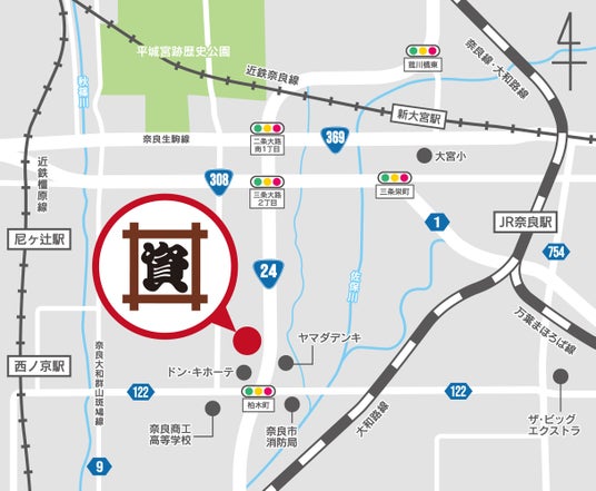 「資さんうどん奈良柏木店」は、国道24号線(奈良バイパス)沿いに位置し、奈良市中心部や大和郡山市方面からもアクセスしやすい立地です。宝来IC方面からもスムーズにご来店いただけますので、広域からお越しいただくお客さまにも便利にご利用いただけます。周辺は住宅地を中心としたエリアで、通勤・通学や週末のお出かけの際にも立ち寄りやすく、ご家族連れからお一人さままで、幅広いお客様にご利用いただける環境です。