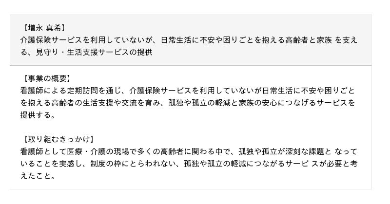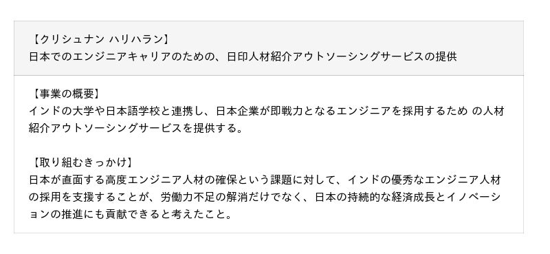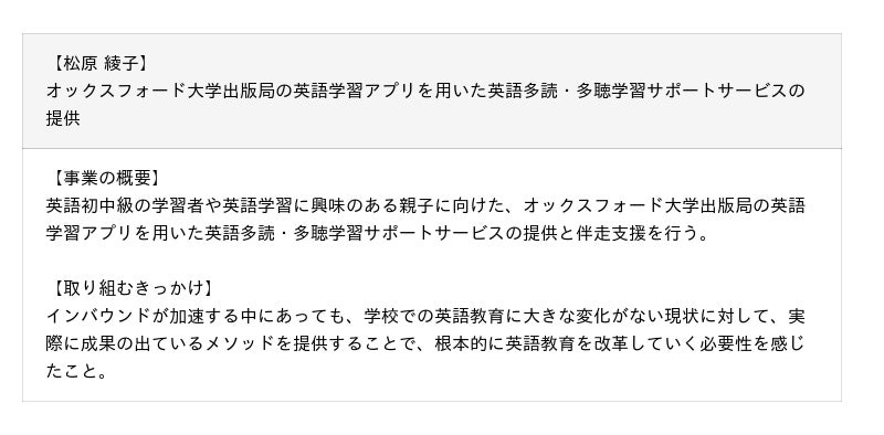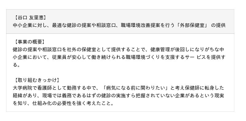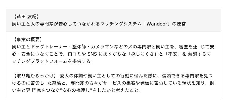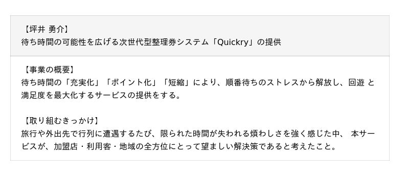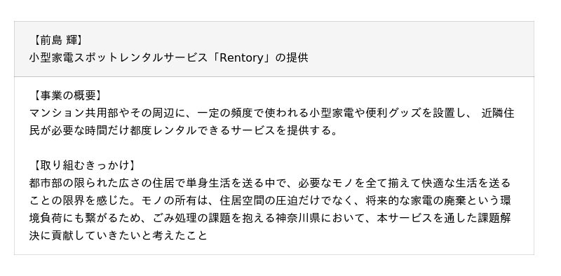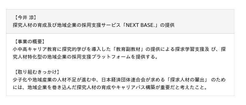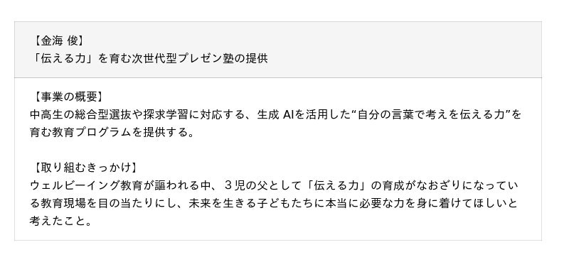 チャレンジャー12名のうち、10名が明確な成果を上げています。ここで言う「成果」とは、単なるアイデア段階にとどまらず、事業のプロトタイプ(試作品)の完成、実証実験の実施、サービスの正式ローンチ、法人設立、初めての顧客獲得、そして新規売上の創出といった、事業が一歩前へ踏み出したことを示すものです。