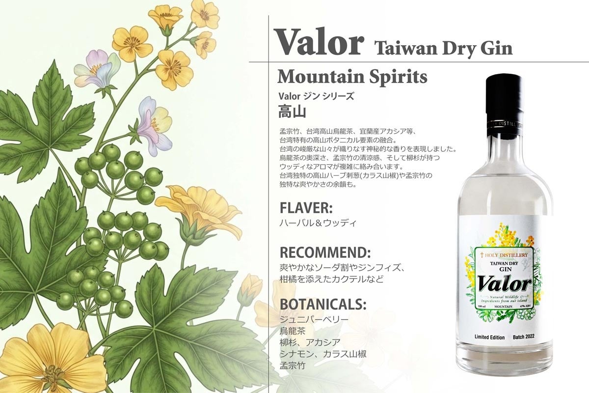 VALOR GIN MOUNTAIN SPIRITS孟宗竹、台湾高山烏龍茶、宜蘭産アカシア等、台湾特有の高山ボタニカル要素の融合。