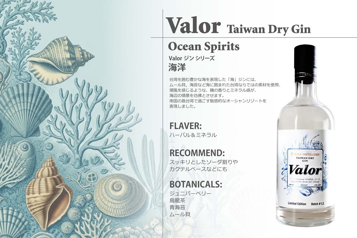 VALOR GIN OCEAN SPIRITS台湾を囲む豊かな海を表現した「海」ジンには、ムール貝,海苔など海に囲まれた台湾ならではの素材を使用、潮風を感じるような、磯の香りとミネラル感が、海辺の情景を彷彿とさせます。