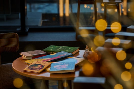 「1/fゆらぎ」と呼ばれる焚火の音にアンビエントミュージックを重ねた、没入感あふれる心地よい音に包まれる空間。蔦屋書店のコンシェルジュが選書したクリスマスブックを片手に、ウイスキーやチョコレートを味わいながら、穏やかな夜をお過ごしください。