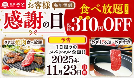 国内199店舗を展開する「和食さと」では、例年11月23日(日・祝)「勤労感謝の日」にお客様感謝の日として特別なキャンペーンを開催しております。本年は、11月23日(日・祝)限定で、人気の焼肉/しゃぶしゃぶ/すき焼きの食べ放題「さと式焼肉/さとしゃぶ/さとすき」の各種対象コースで、大人・シニアのお客様が税抜310円OFFとなる特別企画を開催します。この日限りのプレミアムデーですので、1年の労をねぎらう勤労感謝の日に、是非和食さとの食べ放題をお楽しみください。
