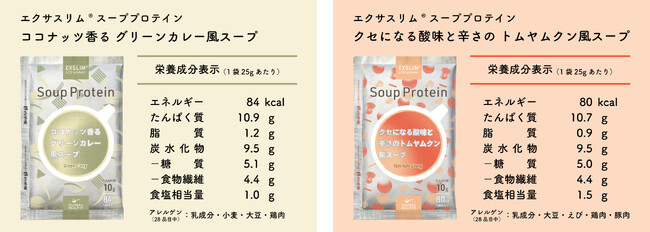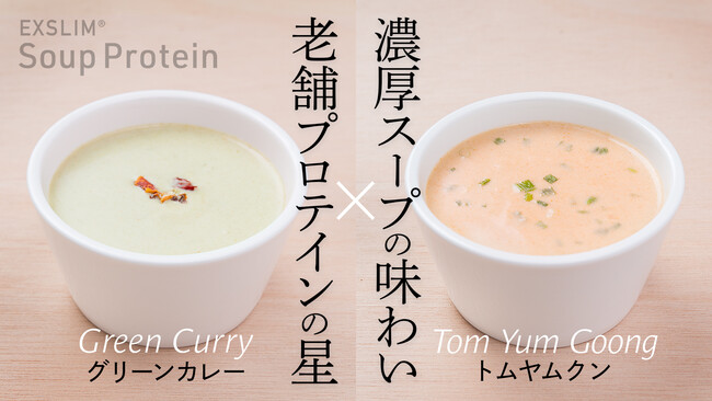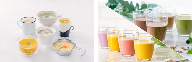 「エクサスリムLCDプロテイン」では、今回、Makuakeで先行予約販売が開始となった2種類のフレーバーを加えると、スープタイプ6種類とドリンクタイプ8種類の、計14種類のラインナップをご提供することとなります。