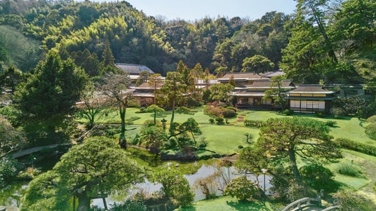 旧三菱財閥の創始者・岩崎弥太郎氏の長男・久彌氏の別邸として、壮大な日本庭園の中に建てられました。歴史と格式ある数寄屋造りの本館は、貴重な国民的財産として有形文化財に登録されています。また新館は文化勲章受章者で建築家村野藤吾氏の設計によるものです。四季の移ろいが美しい庭園は、およそ3,000坪。近代日本庭園の先駆者である京都の庭師・小川治兵衛氏の手による壮大な日本庭園が広がります。