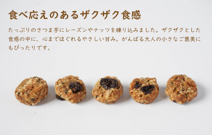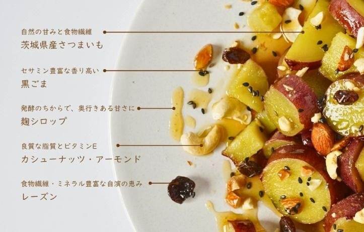 “野菜を補う”新習慣「THIS IS SALAD」に加わった新フレーバーは、割れや不揃いなどの規格外品のさつまいもをたっぷり使用し、レーズンやナッツを加え、日本酒製造副産物のお米をアップサイクルした米麹発酵甘味料でまとめたクランチスナックです。自然の甘味とザクザク食感をお楽しみください。