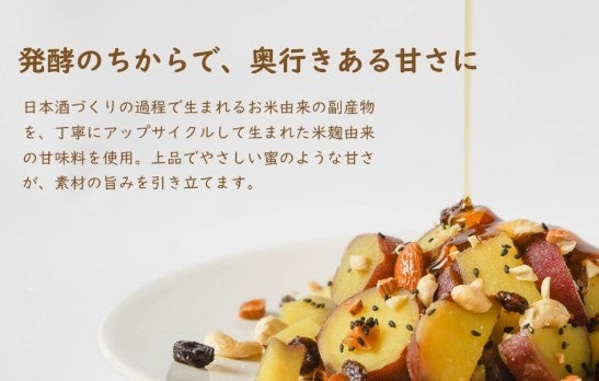 麹発酵甘味料 株式会社オリゼと協業し、日本酒製造時の副産物のお米をアップサイクルした、米麹由来の発酵甘味料を使用。植物由来100%で、砂糖に代わる“やさしい甘み”と“発酵による旨み”を引き出しています。