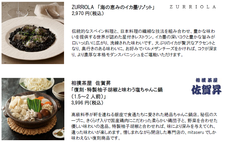 mitaseruの参画店舗は、知る人ぞ知る名店から、予約困難店、世界が認める星付きレストラン、今はなき名店など、三井不動産グループが厳選したバラエティに富んだ店舗ラインナップを目指しています。この度、東京・銀座にあるスペイン料理店「ZURRIOLA」の「海の恵みのイカ墨リゾット」、お店の味を守る美味しいの継承プロジェクト第4弾によって復刻する東京・銀座のちゃんこ料理店「相撲茶屋 佐賀昇」の「復刻・特製柚子胡椒と味わう塩ちゃんこ鍋」など、計7品の新商品が登場しました。