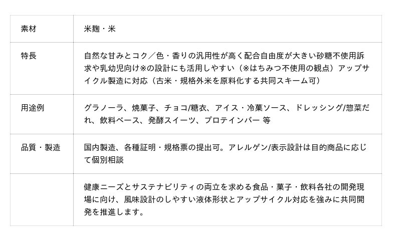 オリゼが提供する「米麹甘味料」は、米麹由来の発酵技術を用いた自然甘味料で、砂糖に代わる“やさしい甘み”と“発酵による旨み”を特徴としています。今回のコラボレーションでは、日本酒製造副産物の米をアップサイクルし、環境負荷を抑えながら自然の甘みを引き立てる原料として採用されました。