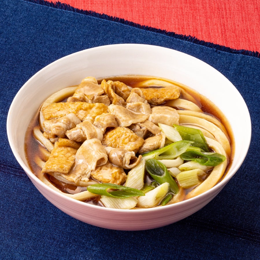 昨年発売した「埼玉県産小麦使用 肉汁うどん」をリニューアル。小麦の外皮に近い部分を多く含む「二等粉」の使用量を大幅に増やし、硬く噛み応えのある太麺に仕立てました。さらに具材の深谷ねぎは、スライス方法を「ぶつ切り」に変更し、量も約2倍に増量。麺の力強さと深谷ねぎのシャキシャキとした食感、そして豚脂100%のラードを使用した濃厚な肉汁つゆが一体となった武蔵野うどんです。