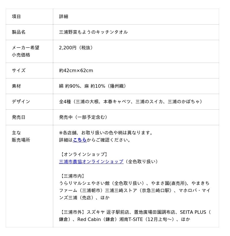 この度、三浦市の三浦野菜認知拡大という地域課題に対する一つのアクションとして、本プロジェクトから「三浦野菜もようのキッチンタオル」が誕生し、本格展開がスタートいたしましたことをお知らせいたします。