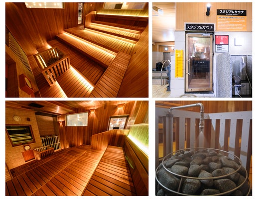 ● 男性高温サウナ→オートロウリュウ「スタジアムサウナ」HUUMヒーターを追加導入し、エストニア産の木材がふわりと香る、心地よいサウナ空間へと生まれ変わりました。ツヤのある美しい木材が室内を包み込み、スタジアムの名にふさわしく、熱を多方向から感じられる開放的な空間を演出しています。さらにオートロウリュウの採用により、サウナ室全体にゆっくりと熱が巡り、これまでとはひと味違う満足感のあるサウナ体験をお楽しみいただけます。
