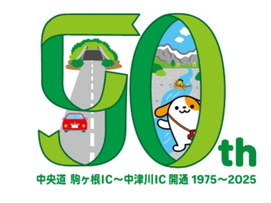 数字の「50」を英語の「go」にかけてデザインし、高速道路の「前進する力」や「未来への希望」を表現するとともに、E19中央道がこれからも人と人、地域と地域を結びつける役割であることを願ってリボンのようなデザインとしています。また、50周年を迎える区間を想起させる恵那山トンネル、中央アルプスや天竜川を当社オリジナルキャラクターの「みちまるくん」とともに描いています。
