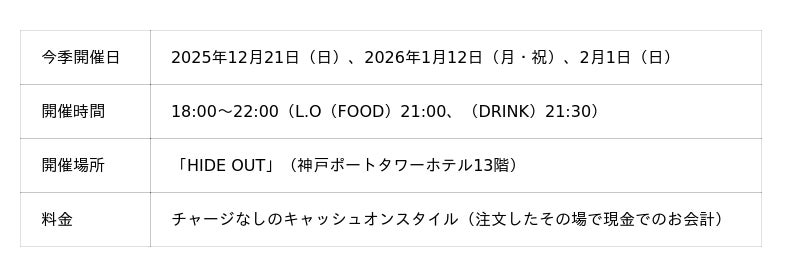 「HIDE OUT SESSION KOBE BAR PORT CRUISE」 12月~2月イベントスケジュール