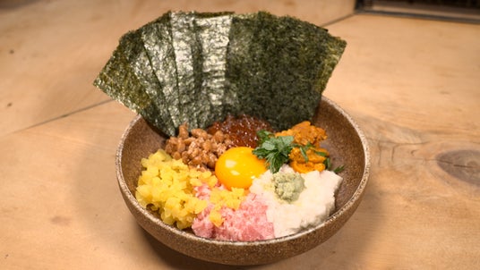ご飯の上にウニ、イクラ、中落ちマグロ、たくあん、南東、長芋、大葉、卵黄、ワサビが乗った贅沢な「ばくだん」。そのばくだんに込められた店主の想いとは?