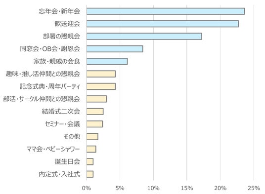 ? 大人数宴会に参加する機会は増加傾向!中には1年で10回以上参加した人も。定番シーンは、会社の忘年会・新年会・歓送迎会など。