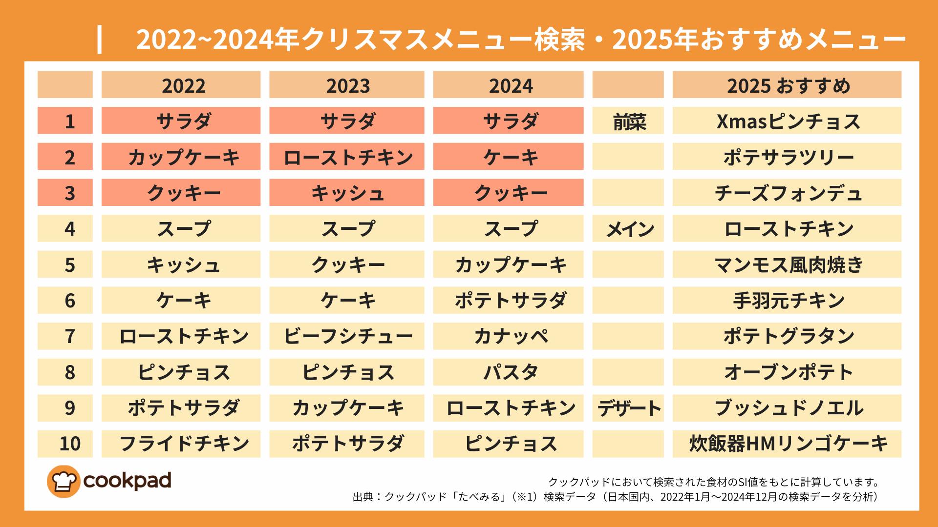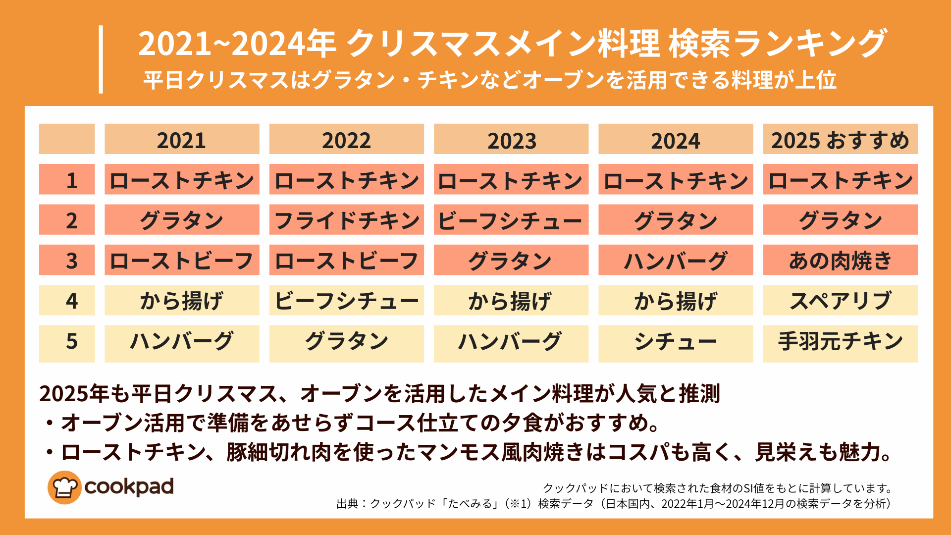 クックパッドの検索データ(※2)で、2021年~2024年のクリスマスメニュー検索ランキングを見ると、クリスマスの曜日と物価状況によってメイン料理の選択が大きく変化しています。