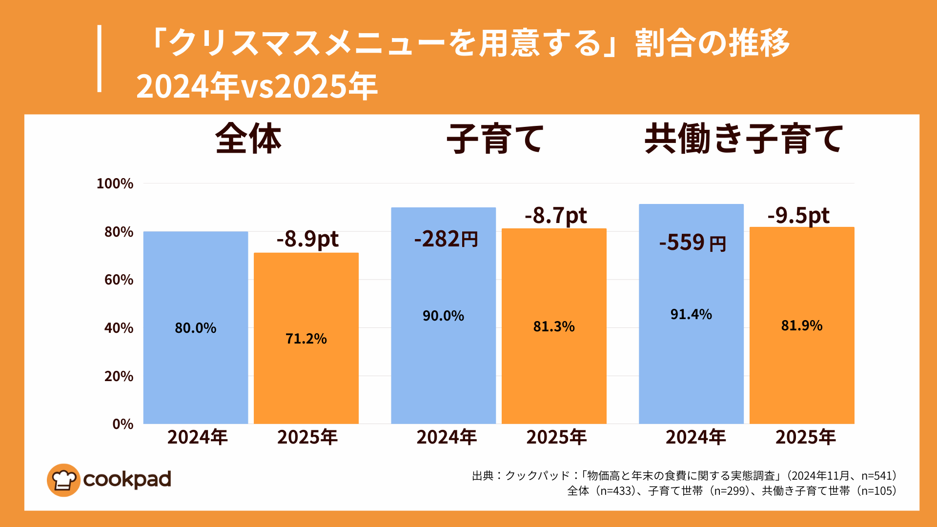 「何らかのクリスマスを用意する」割合は、全体で80.0%から71.2%へ8.9pt減少、子育て世帯で90.0%から81.3%へ8.7pt減少、共働き子育て世帯で91.4%から81.9%へ9.5pt減少しました。減少幅は大きいものの、共働き子育て世帯の81.9%が「何らかのクリスマス料理を用意する予定」と回答。「特に特別な料理は用意しない」は18.1%に留まり、子どもとのクリスマスを大切にする姿勢が明確です。