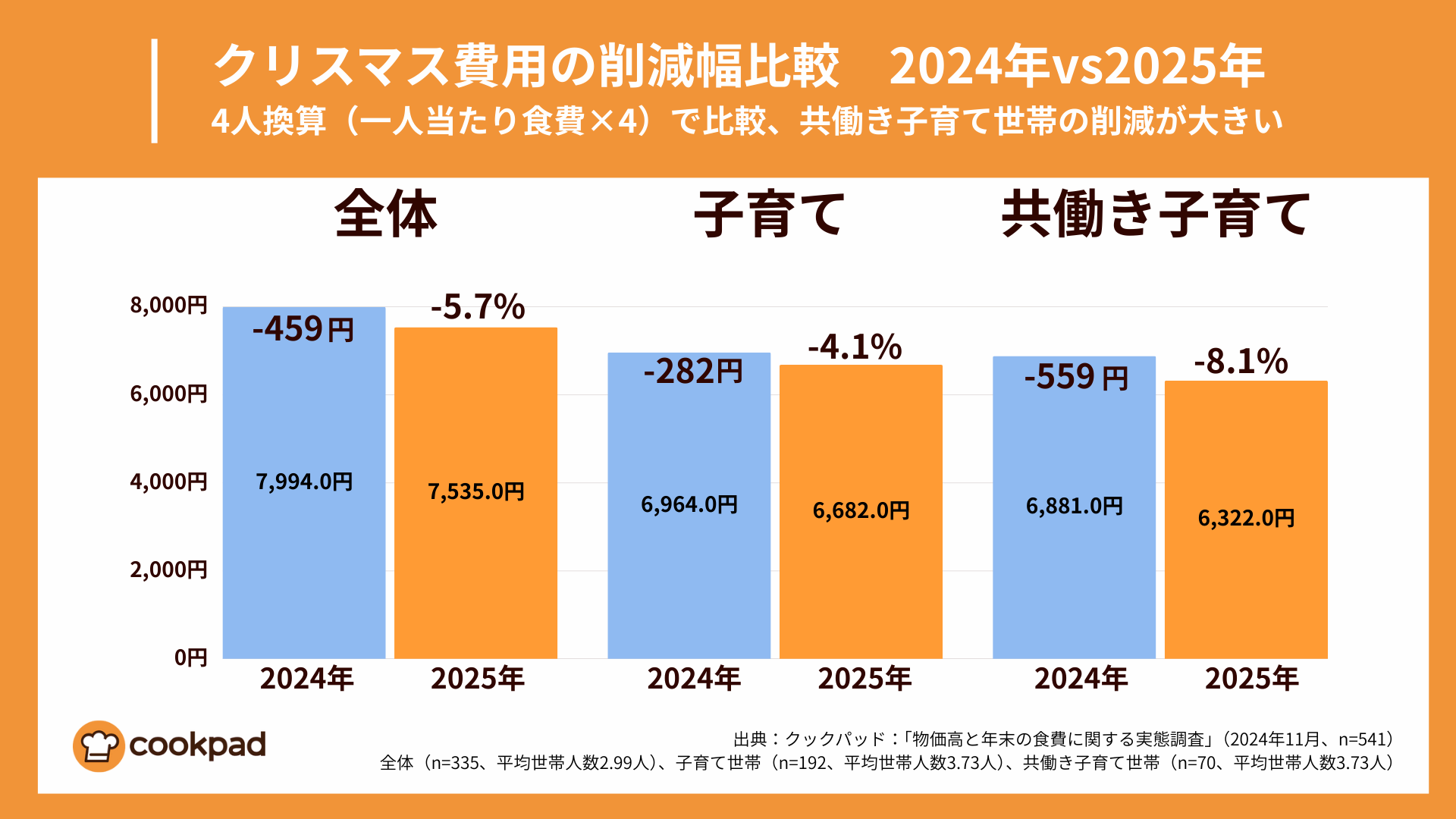 クリスマス費用は、全体で5,984円から5,640円へ343円減少(-5.7%)。子育て世帯では6,492円から6,229円へ263円減少(-4.1%)と削減幅が小さい一方、共働き子育て世帯では6,414円から5,893円へ521円減少(-8.1%)と削減幅が最も大きくなっています。特に共働き子育て世帯は、今年のクリスマスが平日であり、日常の食費増加(+20.4%)の2点を理由として、今年のクリスマスは前年よりも予算を削減していると推察されます。