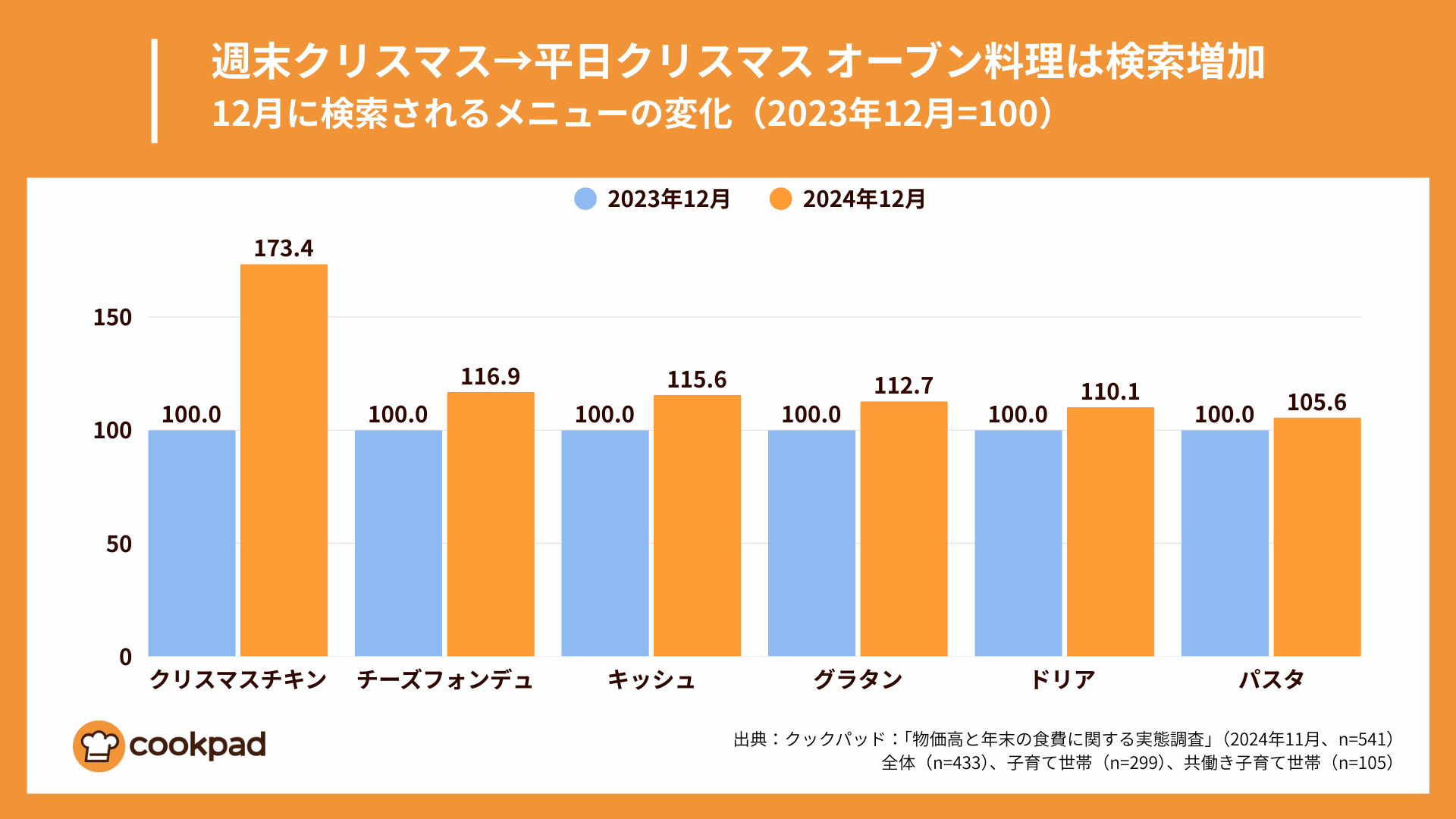 利用者数No.1レシピサービス「クックパッド」を運営するクックパッド株式会社は、普段料理を作る人を対象にクリスマスと食費に関する実態調査を実施しました(n=541、うち共働き子育て世帯105人)※1。2025年は2年連続の「平日クリスマス」(12/25木曜)。物価高で月の食費が約20%増加する中、クリスマス費用は平均5,640円(世帯平均2.99人、前年比-5.7%)。それでも共働き子育て世帯の81.9%は「何らかの料理を用意する予定」と回答しました。手作りケーキが25.6%(前年比+5.8pt)に増加し、2023年12月(週末クリスマス)と2024年12月(平日クリスマス)の検索データ※2比較では「クリスマスチキン」+73.4%、「グラタン」+16.9%と、オーブンを活用した時短メニューが急伸。2025年も同様の傾向が予想されます。
