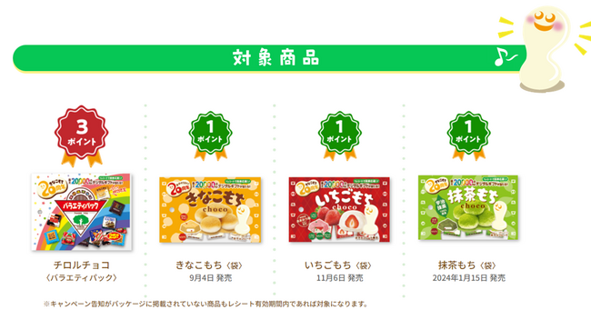 チロルチョコ〈バラエティパック〉、きなこもち〈袋〉、いちごもち〈袋〉、抹茶もち〈袋〉