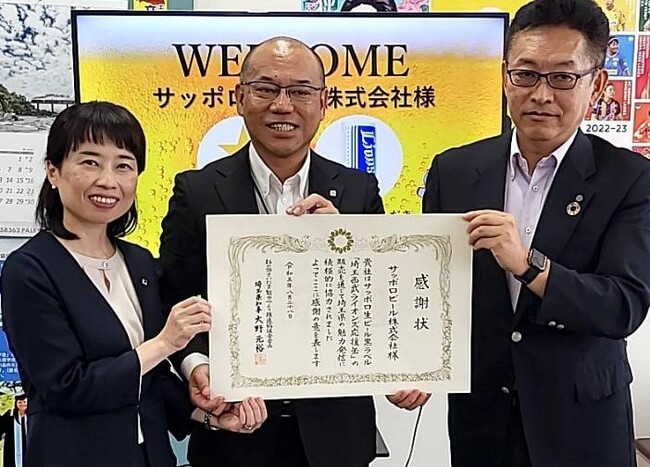 サッポロホールディングス(株)のグループ企業であるサッポロビール(株)は、本年5月に埼玉県を中心に数量限定発売した「サッポロ生ビール黒ラベル 埼玉西武ライオンズ応援缶」の売り上げの一部を、8月28日に埼玉県「彩の国さいたま魅力づくり推進協議会」へ寄付しました。