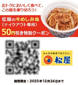 株式会社エデンレッドジャパン(所在地:東京都港区、代表取締役:天野総太郎)と株式会社松屋フーズ(本社:東京都武蔵野市、代表取締役社長:瓦葺 一利、以下松屋)は、松屋の「牛めし弁当」がテイクアウト限定で50円引きとなるクーポンをチケットレストラン公式アプリ「My Edenred」にて配布する「師走も松屋の牛めしで働く人を応援!チケットレストラン特別割引キャンペーン」を2025年11月25日(火)~12月24日(水)まで実施いたします。