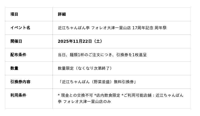 「近江ちゃんぽんをニッポンのちゃんぽんに!」を掲げるドリームフーズ株式会社(本社:滋賀県彦根市/代表取締役社長:山本英柱)は、「近江ちゃんぽん亭 フォレオ大津一里山店」が開店17周年を迎えることを記念し、2025年11月22日(土)に「17周年記念 周年祭」を開催いたします。