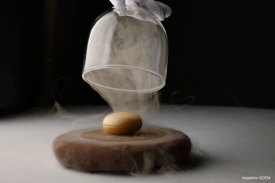 前菜は、ガラスに閉じ込められたスモークを纏って登場する?霧の中のカキえもん“。最中に詰めた厚岸産牡蠣のアイスが得も言われぬハーモニーを奏でます。