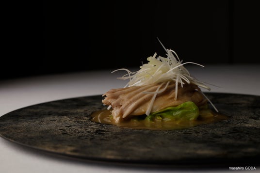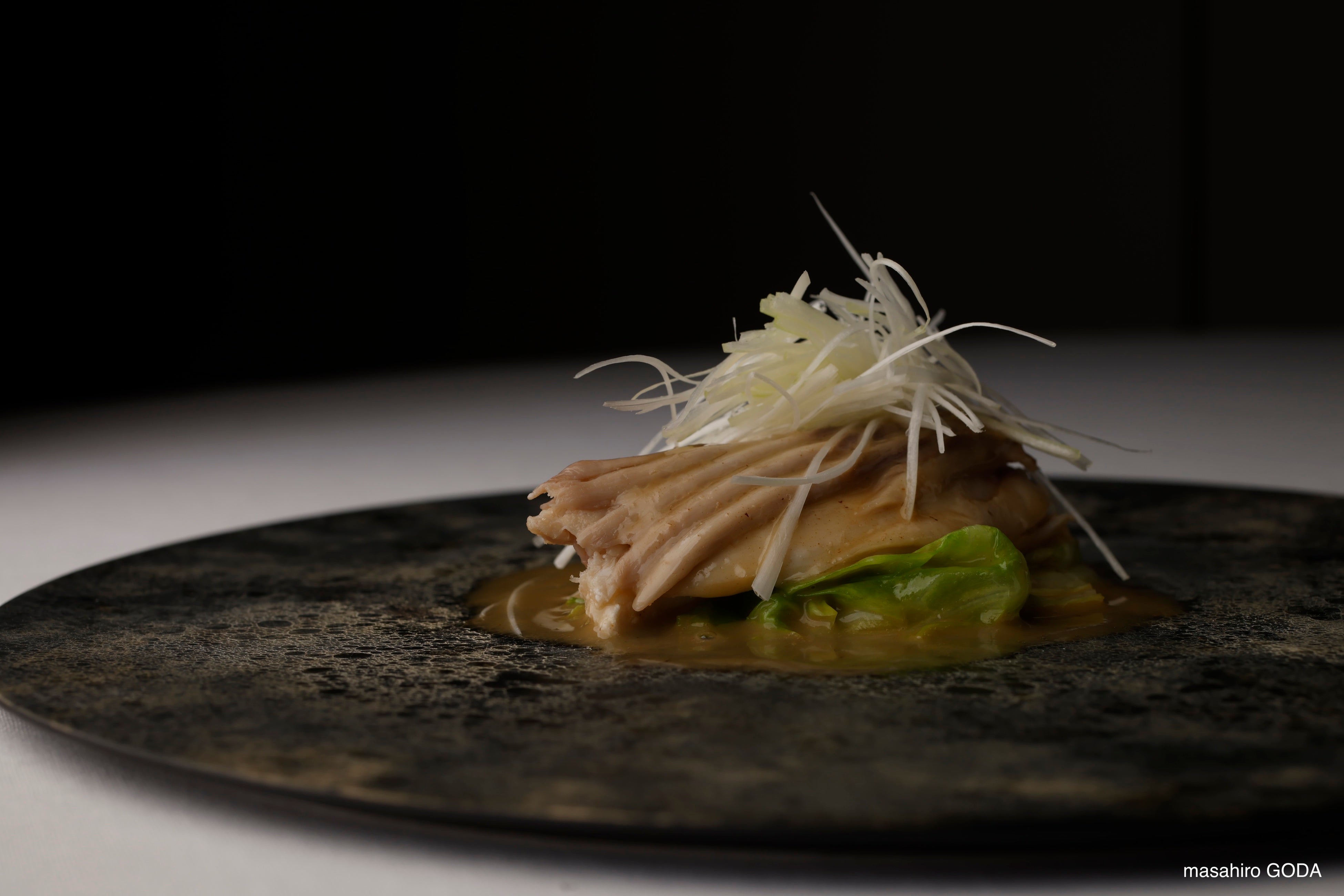 魚料理の「近海産ガンギエイ キャベツ シェリービネガーソース」は、因藤徳郁エグゼクティブシェフがかつて師事した、東京・三田のフランス料理店「コートドール」の斉須政雄氏に捧げるオマージュ。函館「マルヒラ川村水産」の12kgもの近海産ガンギエイを、ダイナミックで香り高い一品に仕上げました。