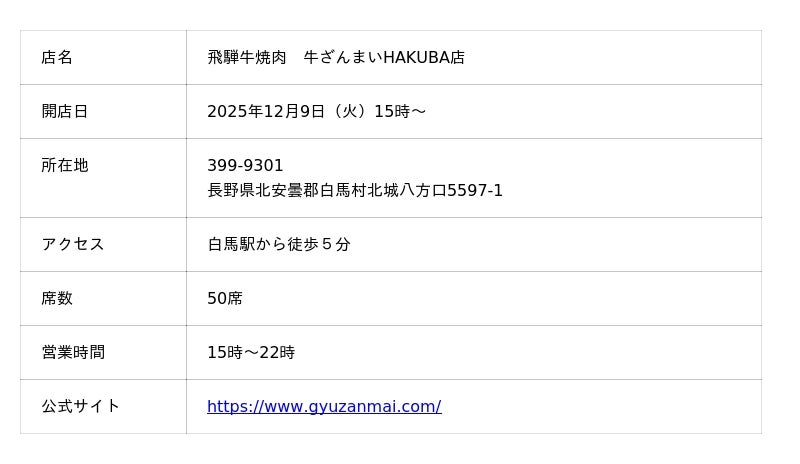 株式会社AJドリームクリエイト(本社:愛知県名古屋市、代表取締役:蓮川 昌実)は、2025年12月9日(火)、愛知県を中心に13店舗を展開する「飛騨牛焼肉 牛ざんまい」の新店舗「HAKUBA店」を、長野県白馬村にオープンします。国内外から多くの観光客が訪れる国際的マウンテンリゾート白馬エリアへの初出店です。契約農家から一頭買いし、熟練職人が手切りするこだわりの飛騨牛を、スキーやスノーボードを楽しむインバウンド旅行客にもリーズナブルに提供することで、その魅力を世界へ発信してまいります。