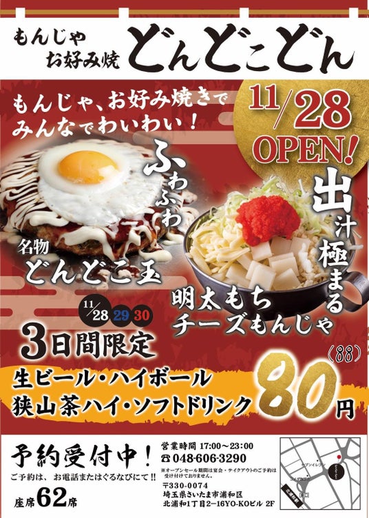 株式会社ミナモト(所在地:埼玉県入間市/代表:細田源太)と、埼玉県内で15店舗を展開する株式会社ロット(所在地:埼玉県戸田市/代表:山崎将志)が共同開発した新ブランド 「もんじゃ お好み焼 どんどこどん 北浦和店」が、2025年11月28日(金)にオープンいたします。