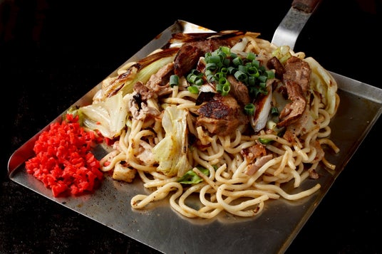 ■ ふわっふわ食感のお好み焼と、もちもち太麺の焼きそば(浅草開花楼の特製麺)