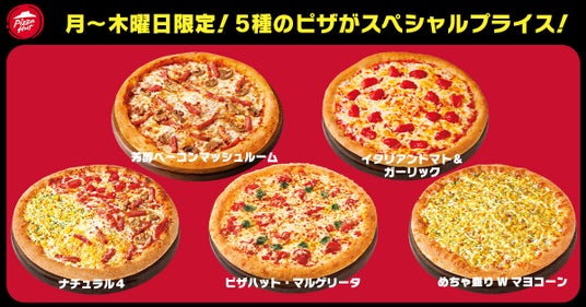 ※対象ピザ:「芳醇ベーコンマッシュルーム」「イタリアントマト&ガーリック」「ナチュラル4」「ピザハット・マルゲリータ」「めちゃ盛り W マヨコーン」