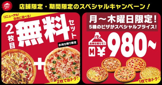 さらに、月~木曜日限定で大人気ピザがお持ち帰り限定980円で楽しめる超おトク企画も同時開催!「ピザハット・マルゲリータ」をはじめ、人気の5種類が対象。