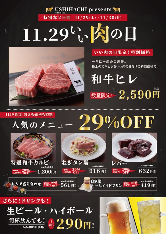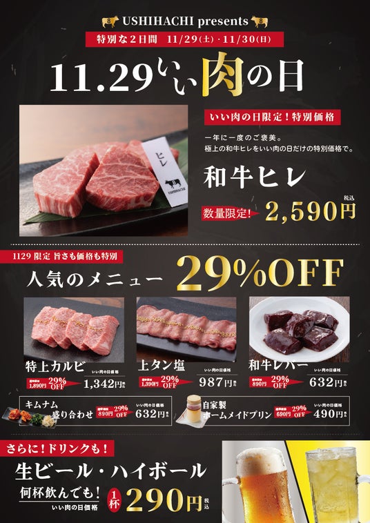 11月29日の"いい肉の日"にちなみ、「和牛ヒレ」が特別価格に、人気メニュー「上カルビ」や「タン塩」を含む厳選5品を29%OFFでご提供。さらに、生ビールとハイボールが何杯飲んでも1杯290円(税込)と破格のお値段でお楽しみいただけます。