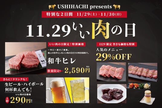 株式会社Brand Bank Company(本社:東京都新宿区、代表取締役社長:根本 寿一)が運営する焼肉店「USHIHACHI」は、2025年11月29日(土)・30日(日)の2日間限りで年に一度の『いい肉の日』キャンペーンを開催いたします。