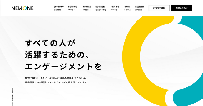 「他にはない、新しい(new one)価値を生み出す」を社名に掲げ、エンゲージメントをテーマに、「個人の意識変革」と「関係性の向上」を中心とした企業向けコンサルティング、人材育成・組織開発を提供。Softbank、カゴメ、三菱地所ホームをはじめ、多数の企業様の支援を実施しています。