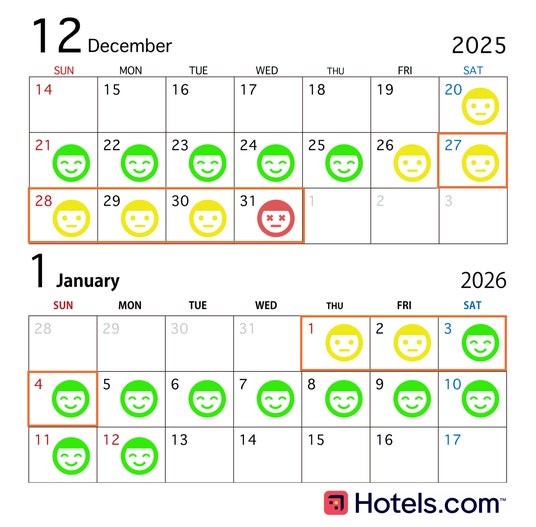 A5. Hotels.comのホテル検索データ*6によると、12月26日(金)から1月2日(金)に宿泊施設が混雑すると予想されます。そのため、混雑を避けたい場合は、12月21日(日)、22日(月)に出発するか、1月3日(土)以降の出発がおすすめです。