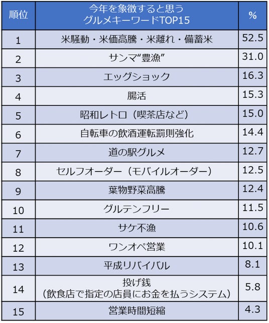 ホットペッパーグルメ外食総研が挙げた20の選択肢の中から「今年を象徴すると思うグルメキーワード」を聞いたところ、過半数が「米騒動・米価高騰・米離れ・備蓄米」を選び、圧倒的1位に。備蓄米放出は連日ニュースになりましたし、日々の生活でもお米の高騰を痛感させられている人が多いことが推測されます。2位になった「サンマ“豊漁”」は逆にうれしいニュース。実際に豊漁だったのかはあいまいですが、年々高騰し続けていたサンマが比較的手ごろな価格で店頭に並び、SNSでも「久しぶりにおいしいサンマを食べられた」という声が見られました。そのほかにも3位「エッグショック」、9位「葉物野菜高騰」、11位「サケ不漁」など、物価の乱高下に振り回された1年でした。