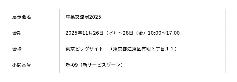産業交流展は、首都圏(東京都・埼玉県・千葉県・神奈川県)に事業所を有する、個性あふれる中小企業などの優れた技術や製品を一堂に展示し、販路拡大、企業間連携の実現、情報収集・交換などのビジネスチャンスを提供することを目的とした展示会です。