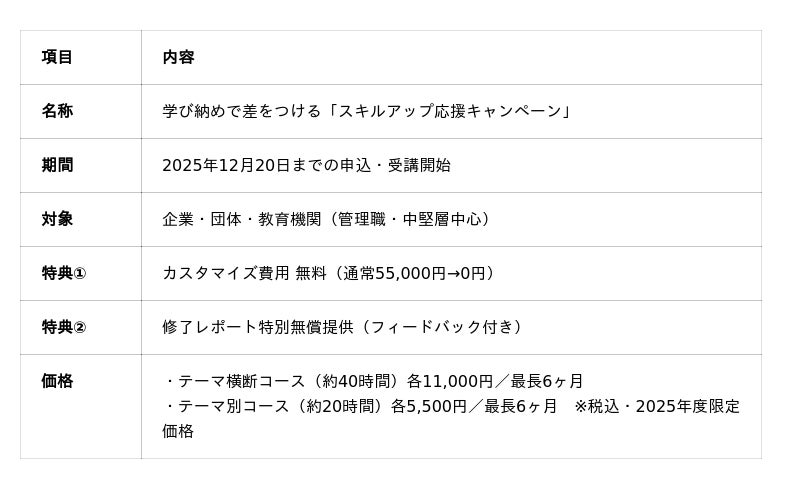 本キャンペーンでは、自社オリジナルカリキュラムのカスタマイズ費用(通常55,000円)を無料とするほか、修了レポート特別無償提供とし、2026年に向けて人材育成を加速させたい企業を支援します。