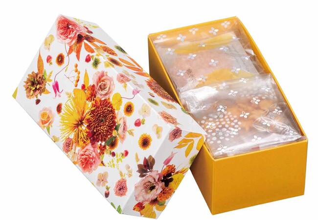 コスモスやリンドウなど、秋を象徴する花々を華やかにデザインした箱に、国産米100%の米菓を45袋入れたボリュームのある詰合せなので、敬老の日や結婚式の引き出物など、特別な贈り物に最適です。