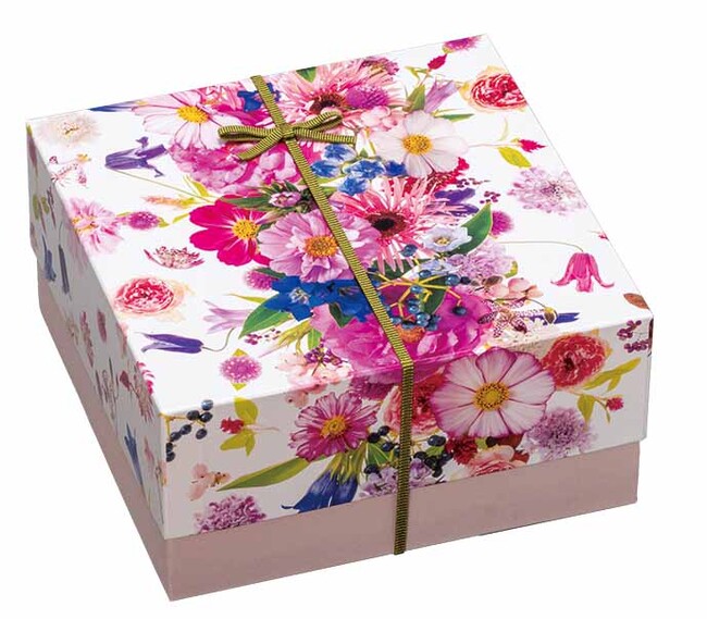 両手におさまるサイズの箱にバラやガーベラ、ナデシコ、スカビオサ、ホワイトスター、マトリカリアといったかわいらしい花々をこぼれんばかりにアレンジしました。ななめがけのリボンがかわいさをアップしています。