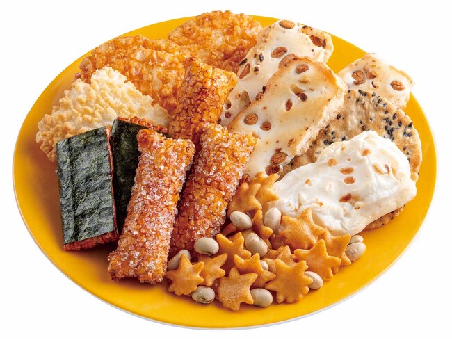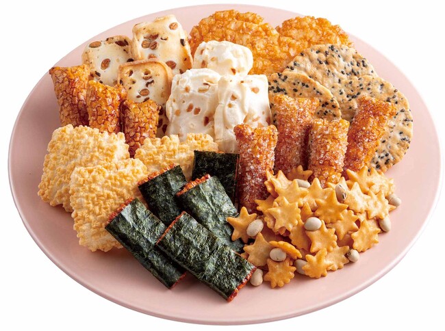 田舎おかき醤油味3本、黄金揚げ6枚、田舎おかきざらめ味6本、紅葉あられ42g、マカダミアナッツおかき3枚、揚もち3枚、越乃豆もち12枚、胡麻せんべい3枚、磯辺巻醤油味6枚